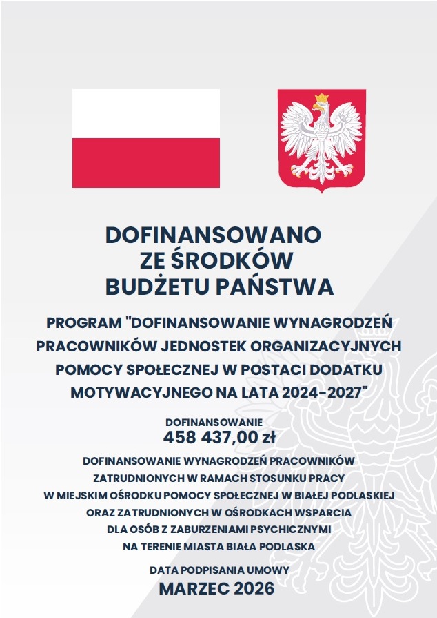 Nazwa zadania: Dofinansowanie zadania własnego Powiatu Miasta Biała Podlaska w zakresie zwiększenia wynagrodzeń oraz pokrycia kosztów składek od tych wynagrodzeń wypłacanych w okresie od 1 stycznia 2026 r. do dnia 31 grudnia 2026 r. w formie dodatku motywacyjnego w wysokości 1000 zł brutto miesięcznie pracownikom zatrudnionym na umowę o pracę w Miejskim Ośrodku Pomocy Społecznej w Białej Podlaskiej i w ośrodkach wsparcia dla osób z zaburzeniami psychicznymi na terenie Miasta Biała Podlaska.