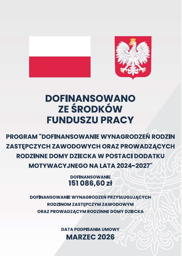 Zgodnie z umową Nr 1308 Wojewoda Lubelski przyznał w 2026 roku Miastu Biała Podlaska środki finansowe budżetu państwa z Funduszu Pracy w formie dotacji celowej w wysokości 151 086,60 zł rodzinom zastępczym zawodowym i prowadzącym rodzinne domy dziecka.